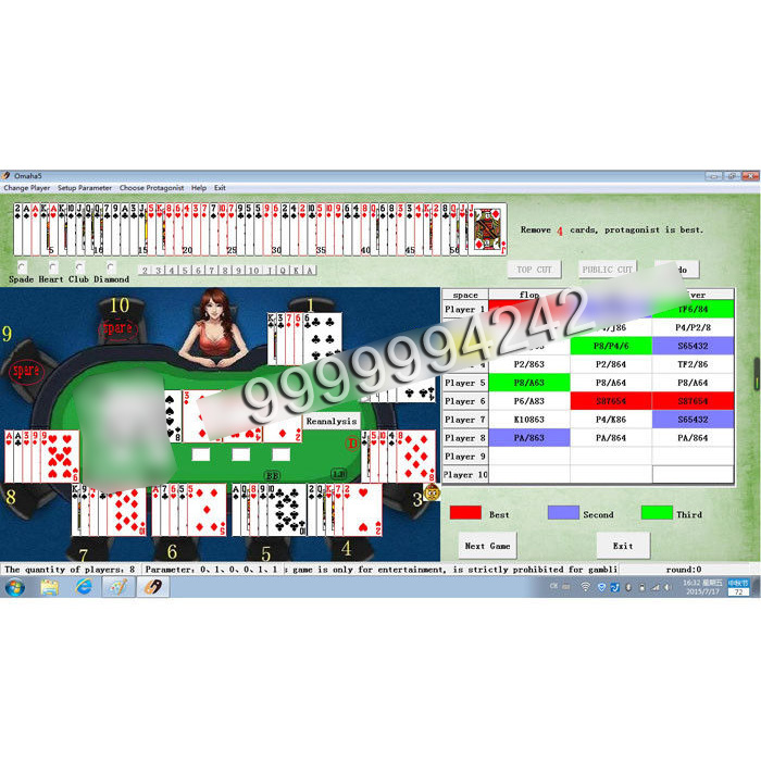 This is a new poker software computer system, this poker system can show you the order of all cards on the top of computer, and also can show you every card which are holding in all players’ hands and covering on the table, what’s more, it also shows you the rank of all players, that is, who is first winner, who is second winner, who is third winner, who is fifth winner and so on.
